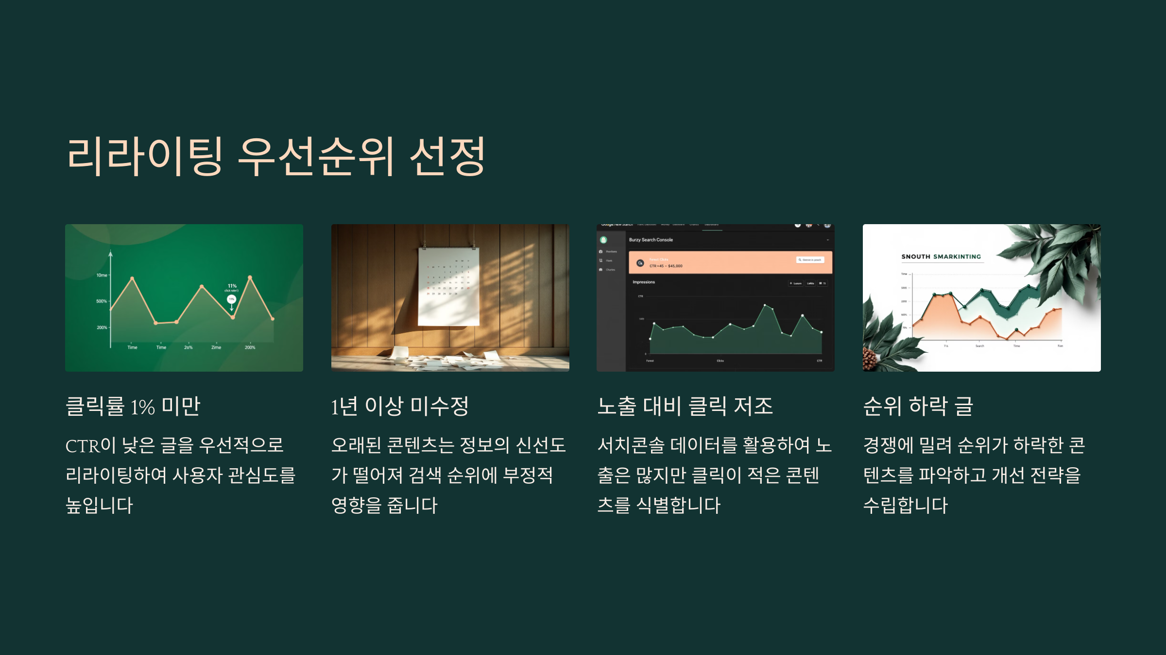 SEO 최적화를 위해 리라이팅할 콘텐츠를 고를 때 다음 기준을 따르세요: