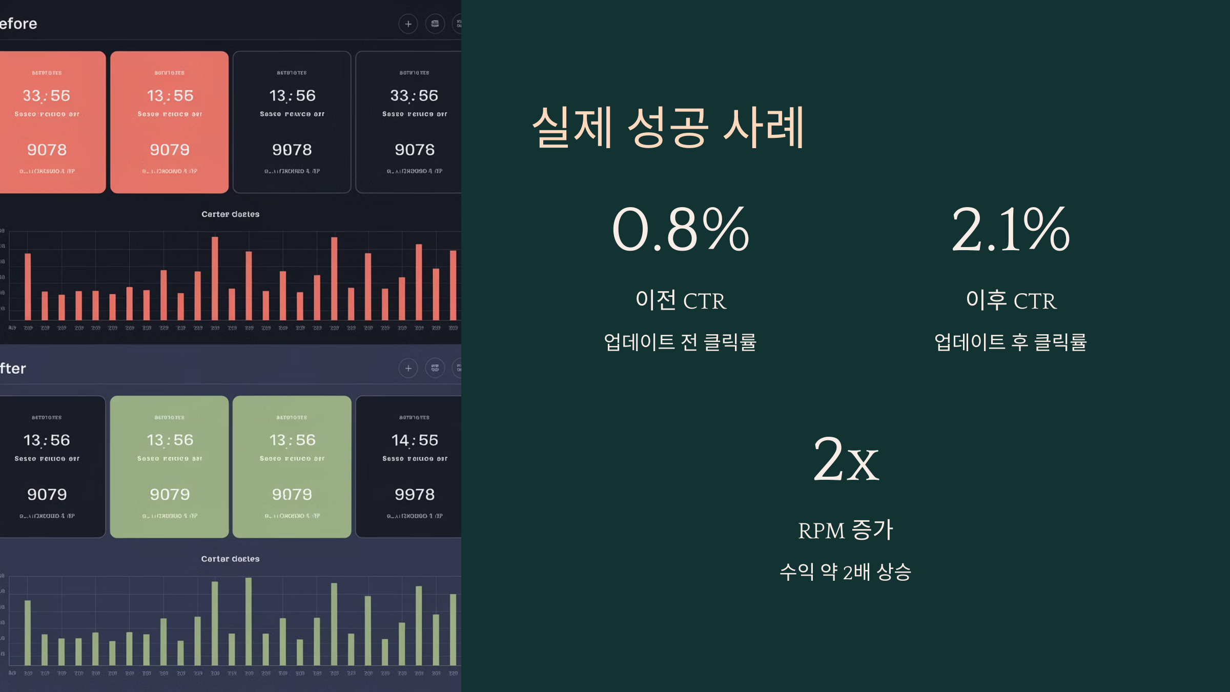 결과적으로 CTR이 0.8% → 2.1%, RPM이 약 2배 증가했습니다.