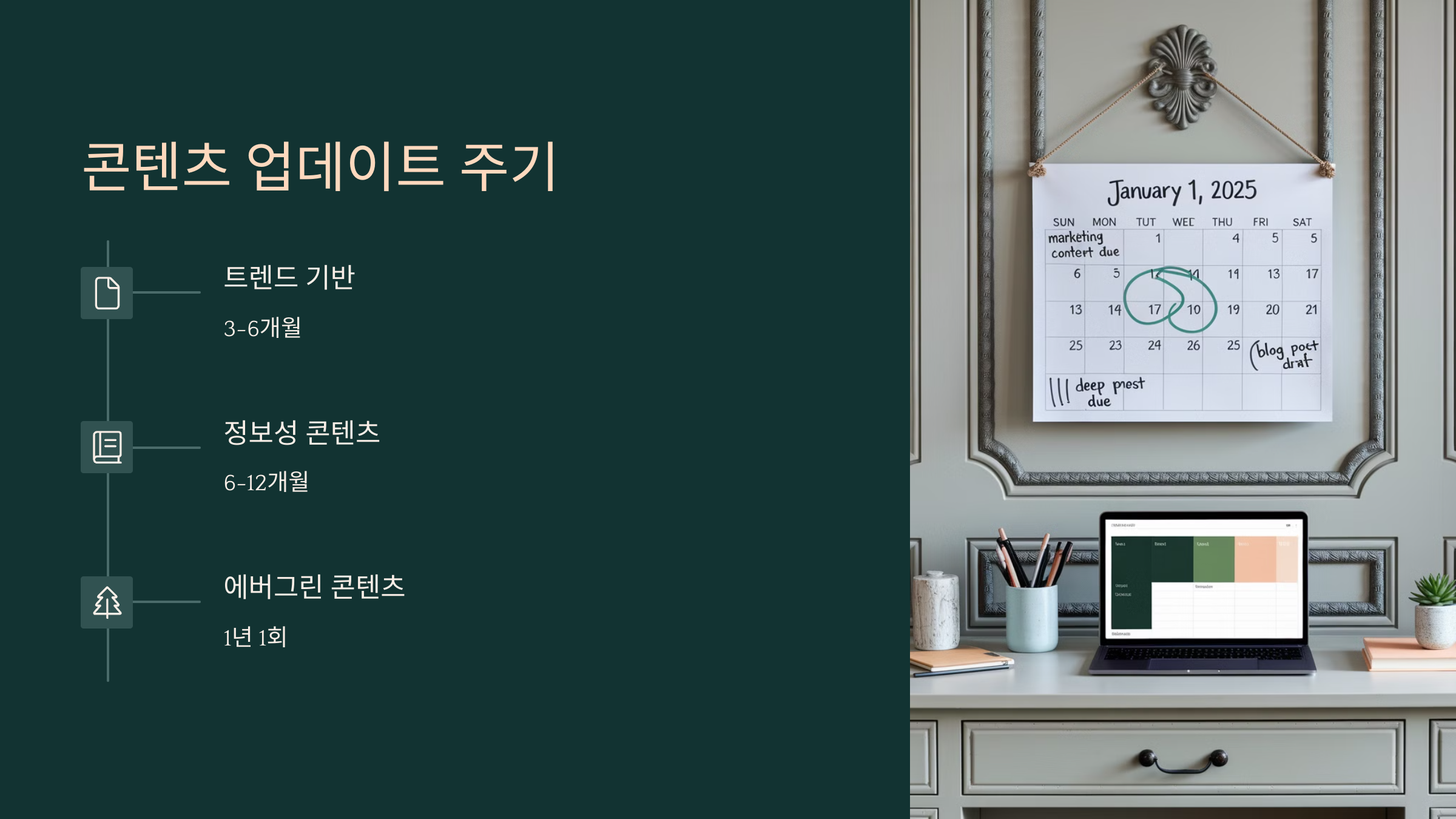 - 트렌드 기반 콘텐츠 → 3~6개월