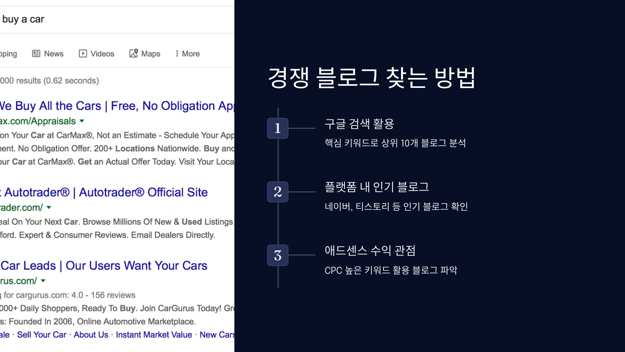 1️⃣ 내 블로그 주제와 관련된 핵심 키워드를 구글에서 검색 2️⃣ 검색 결과 상위 10개 블로그를 분석 3️⃣ 어떤 콘텐츠가 인기 있는지 확인