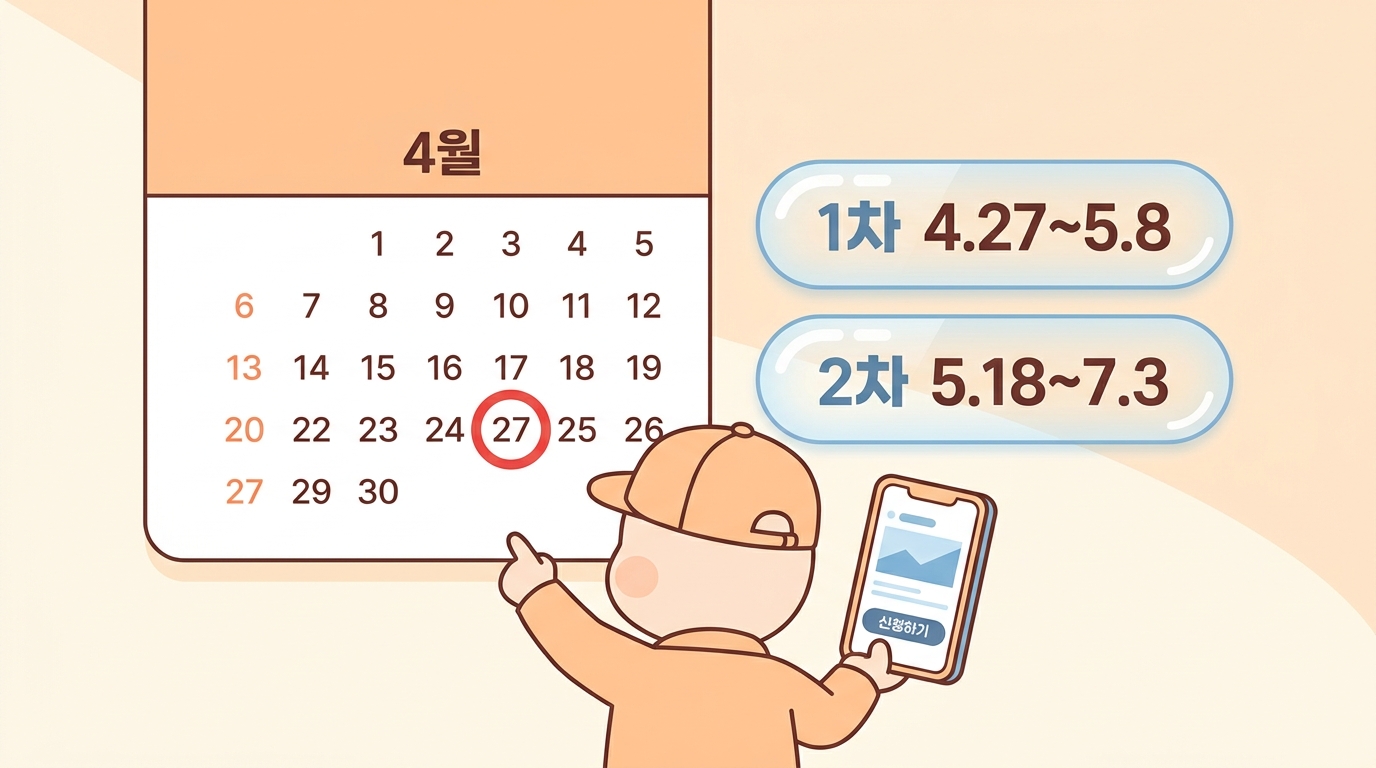 - 1차 신청: 4/27(월) ~ 5/8(금) — 기초생활수급자·차상위·한부모