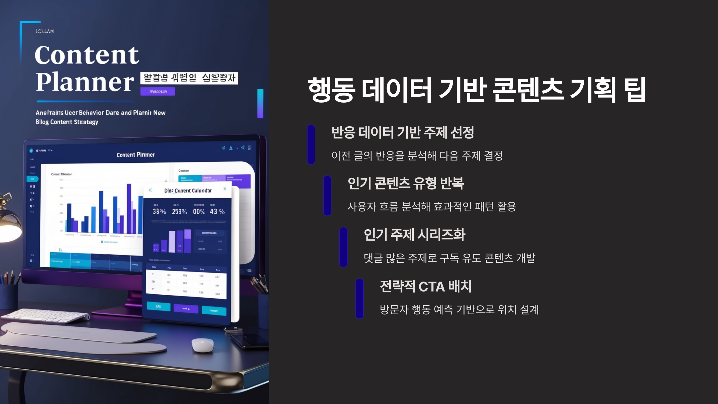 🔹 이전 글의 반응 데이터를 기반으로 다음 주제 선정 🔹 사용자 흐름을 분석해 인기 콘텐츠 유형 반복 배치 🔹 댓글이 많은 주제는 시리즈화, 구독 유도 연결 콘텐츠로 활용 🔹 방문자 행동 예측을 기반으로 CTA 또는 내부 링크의 위치 설계