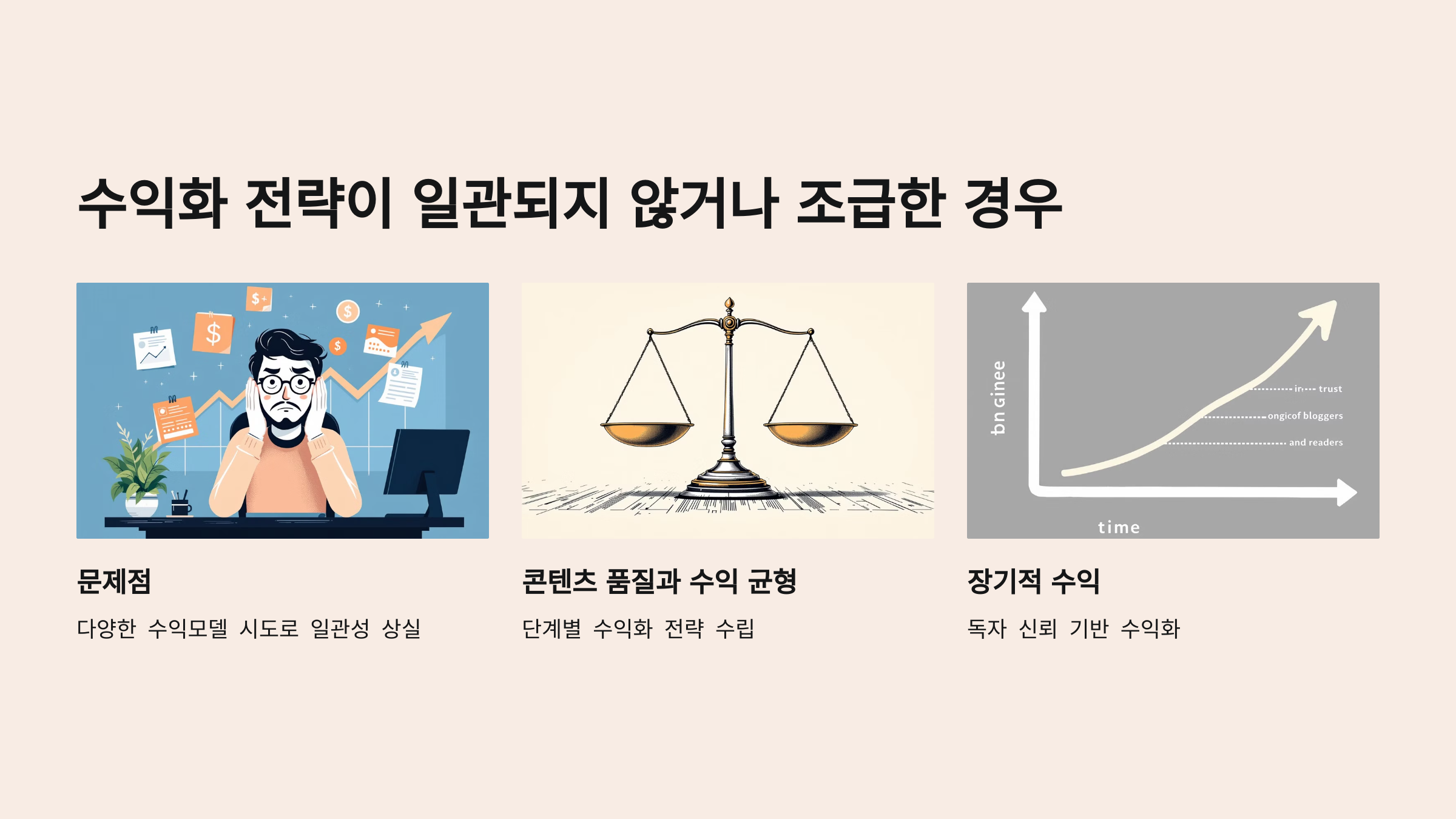 ✅ 5. 수익화 전략이 일관되지 않거나 조급한 경우
