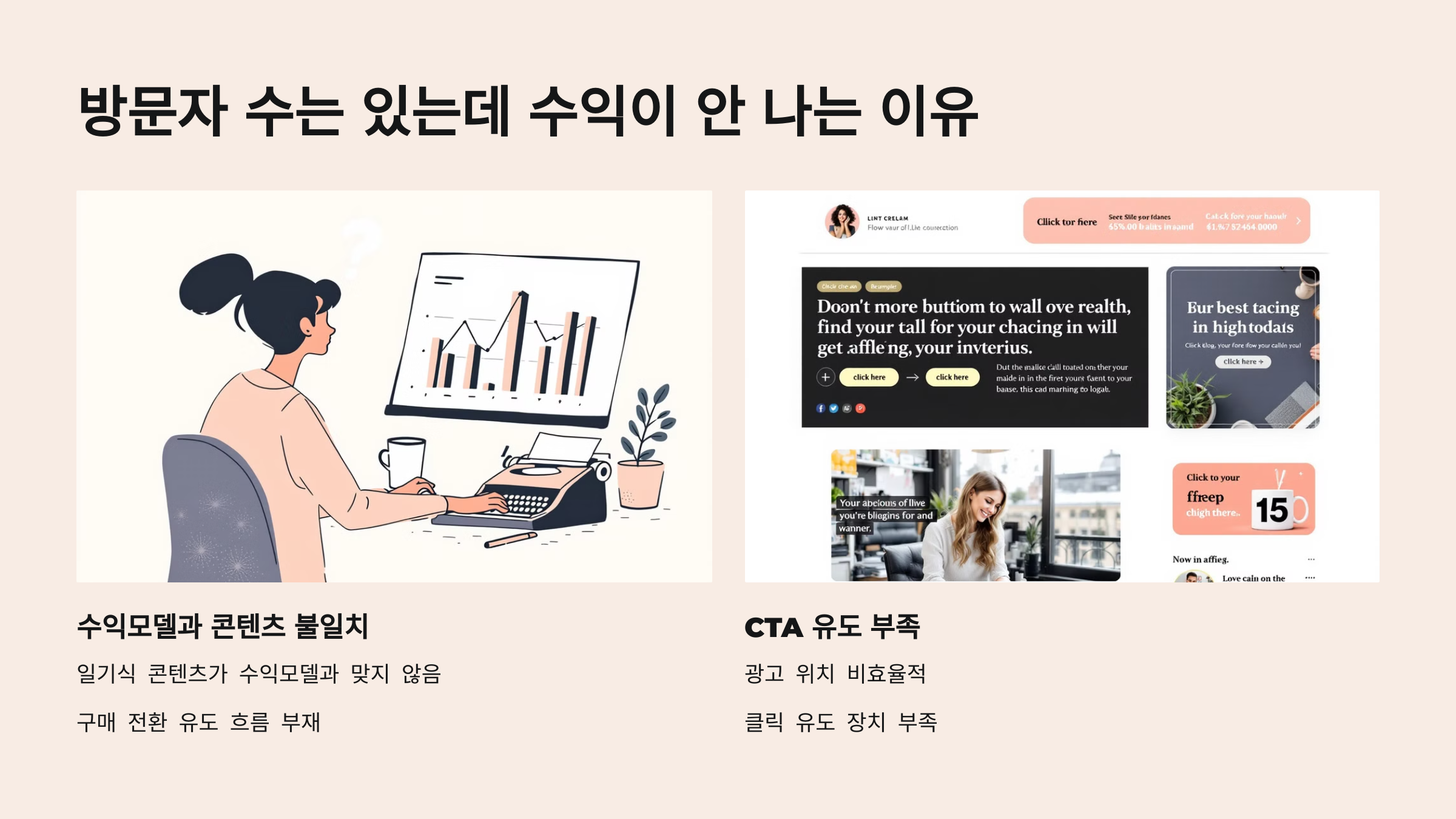 ✅ 1. 방문자 수는 있는데 수익이 안 나는 이유