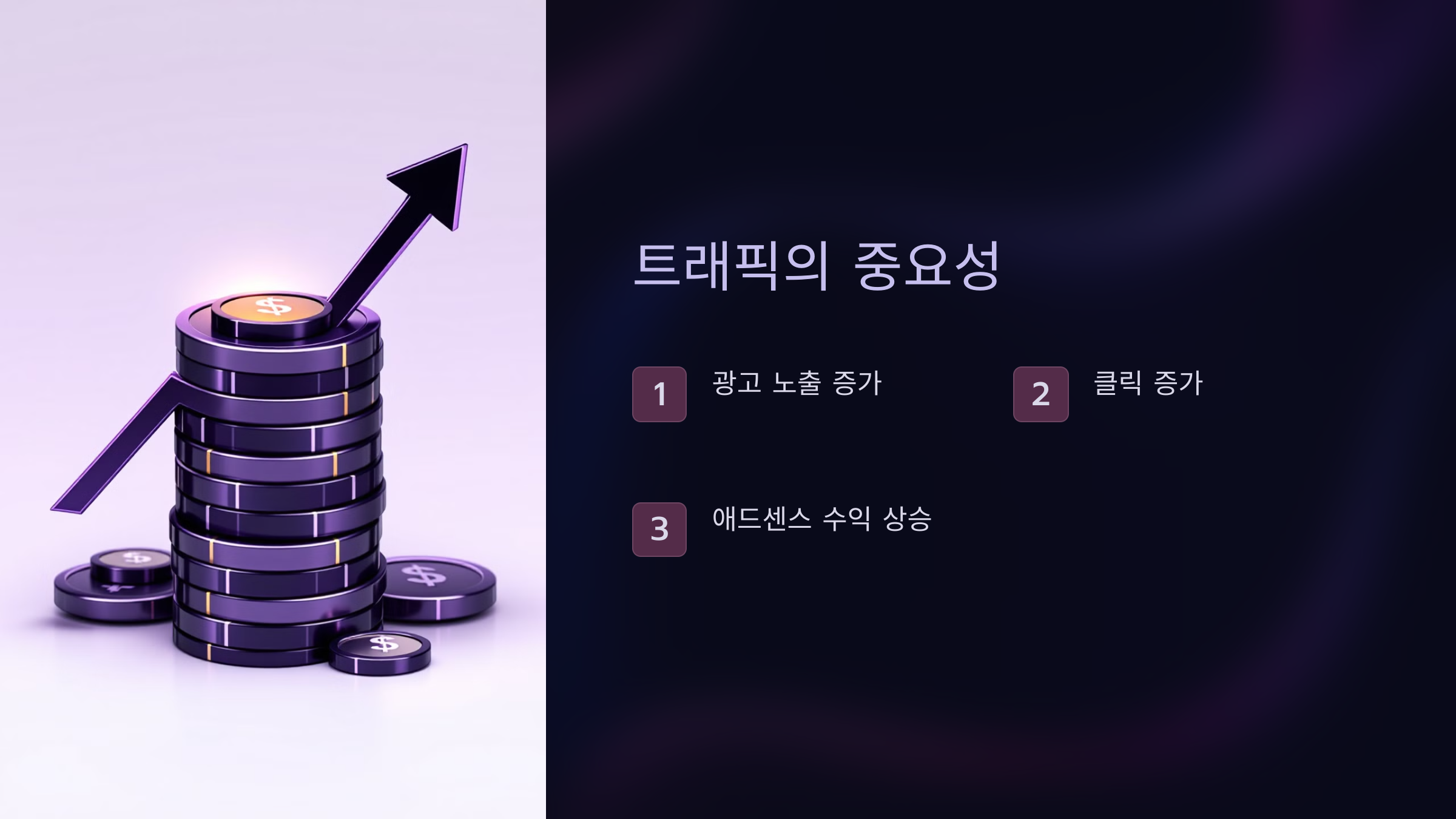 트래픽이 많아야 광고 노출과 클릭이 증가하여 애드센스 수익이 올라갑니다.