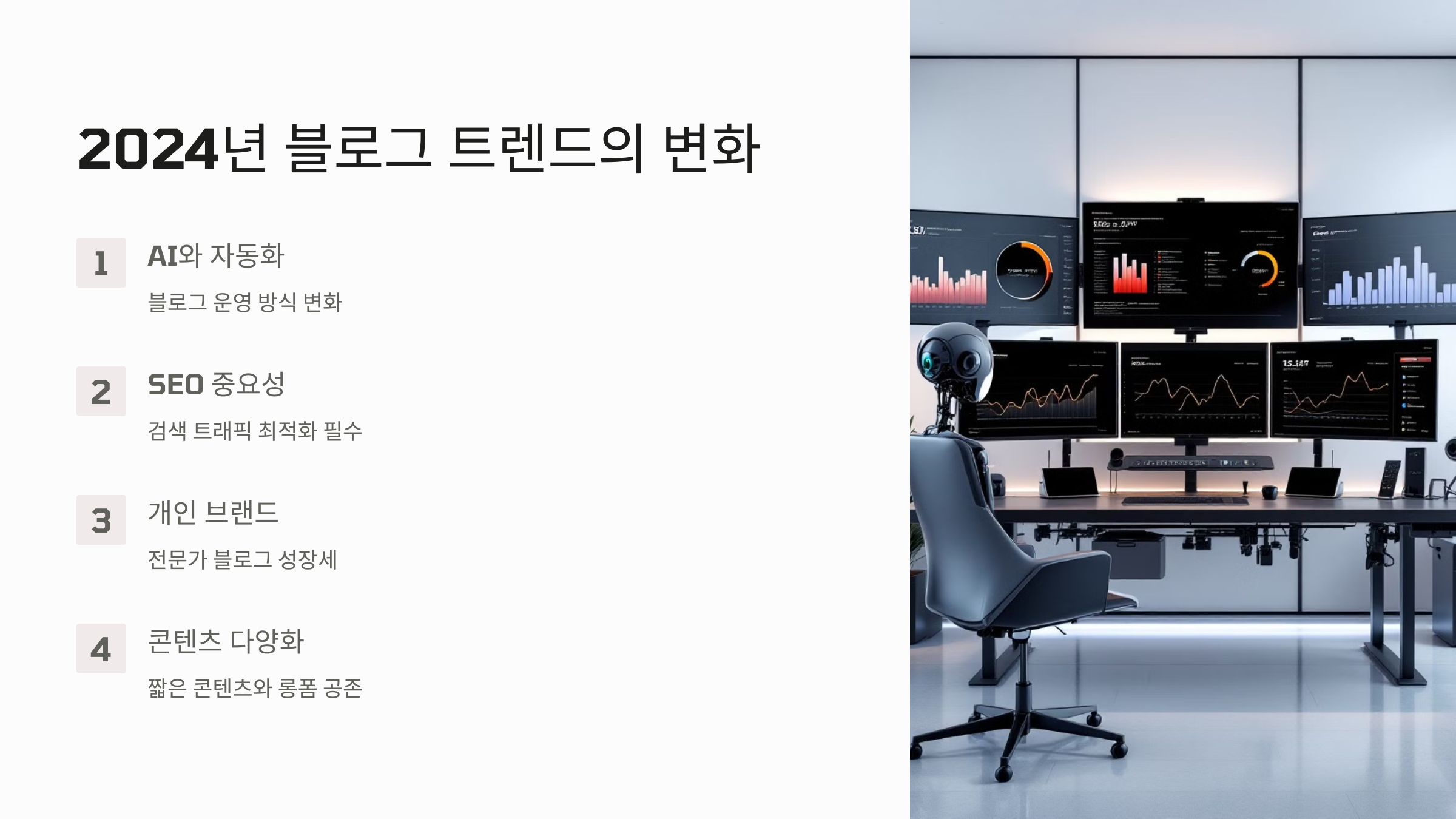 ✅ AI와 자동화 기술의 발전으로 블로그 운영 방식 변화 ✅ SEO 및 검색 트래픽 최적화의 중요성 증가 ✅ 개인 브랜드 및 전문가 블로그 성장 ✅ 짧고 강렬한 콘텐츠 vs 심층적인 롱폼 콘텐츠 공존 ✅ SNS 및 유튜브와의 연계 강화