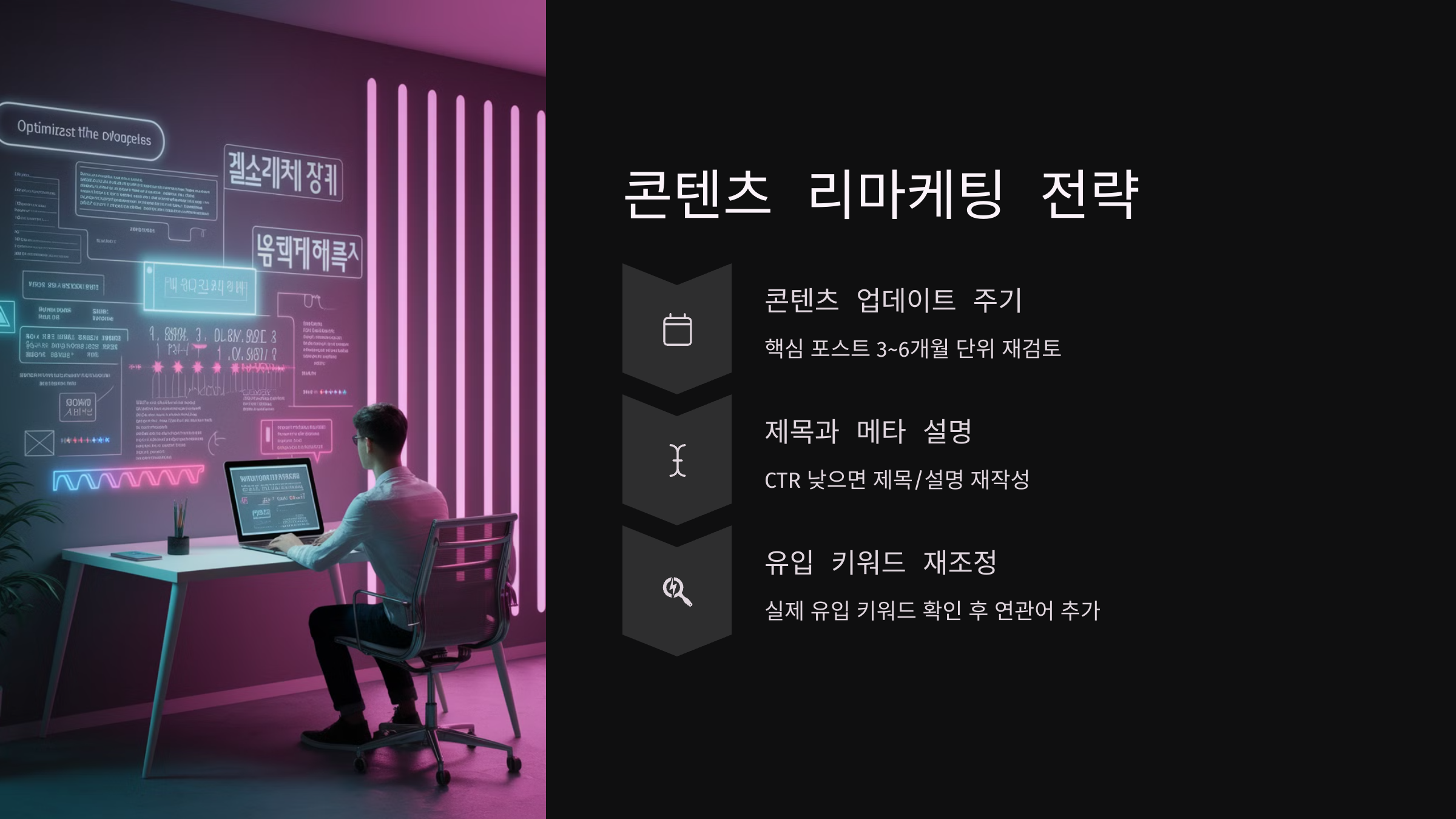 ✔ 검색 유입을 지속시키려면 콘텐츠 업데이트, 구조 개선, 내부링크 정비가 필요하다