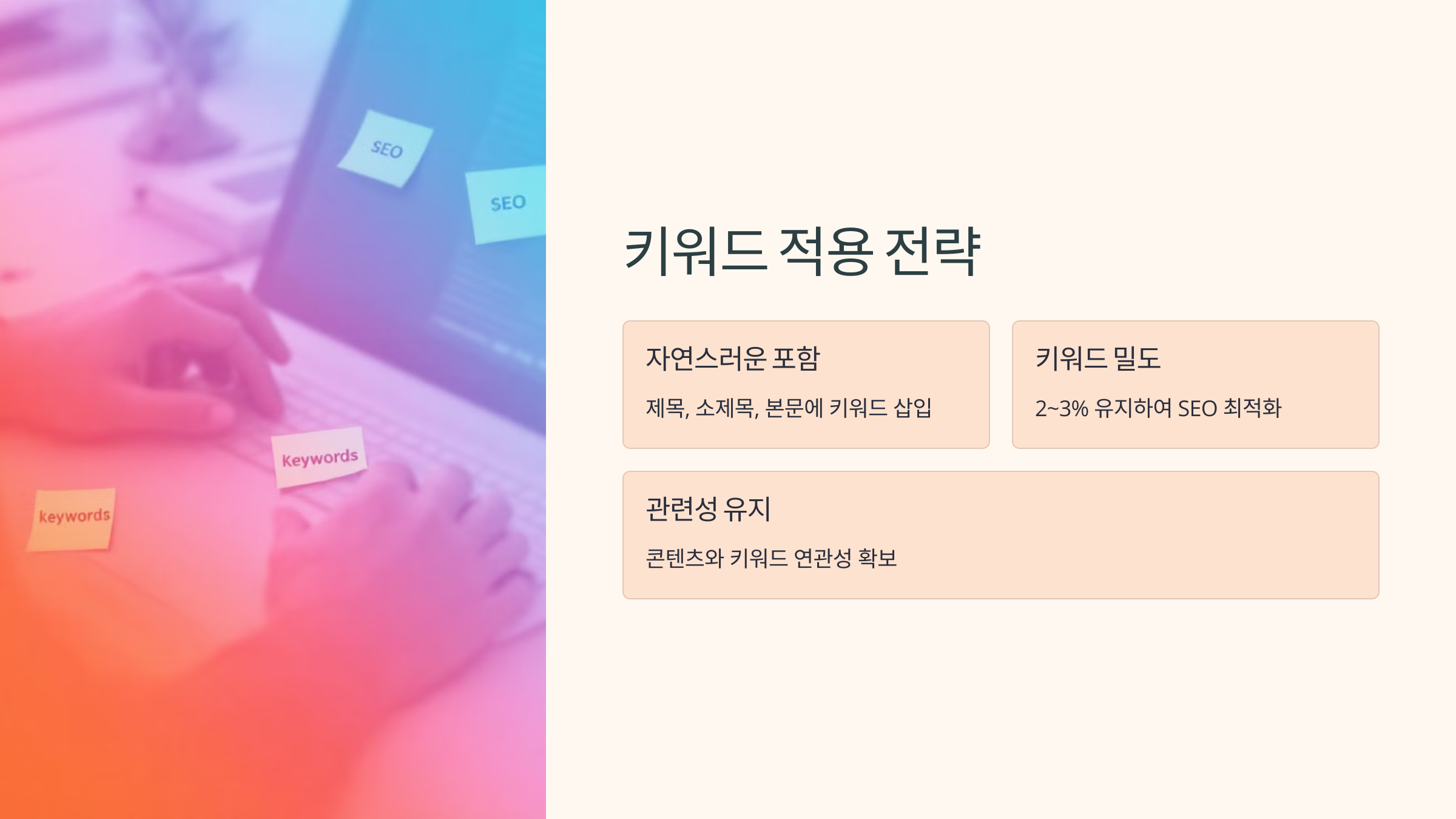 - 키워드 밀도를 2~3% 정도 유지하여 SEO 최적화