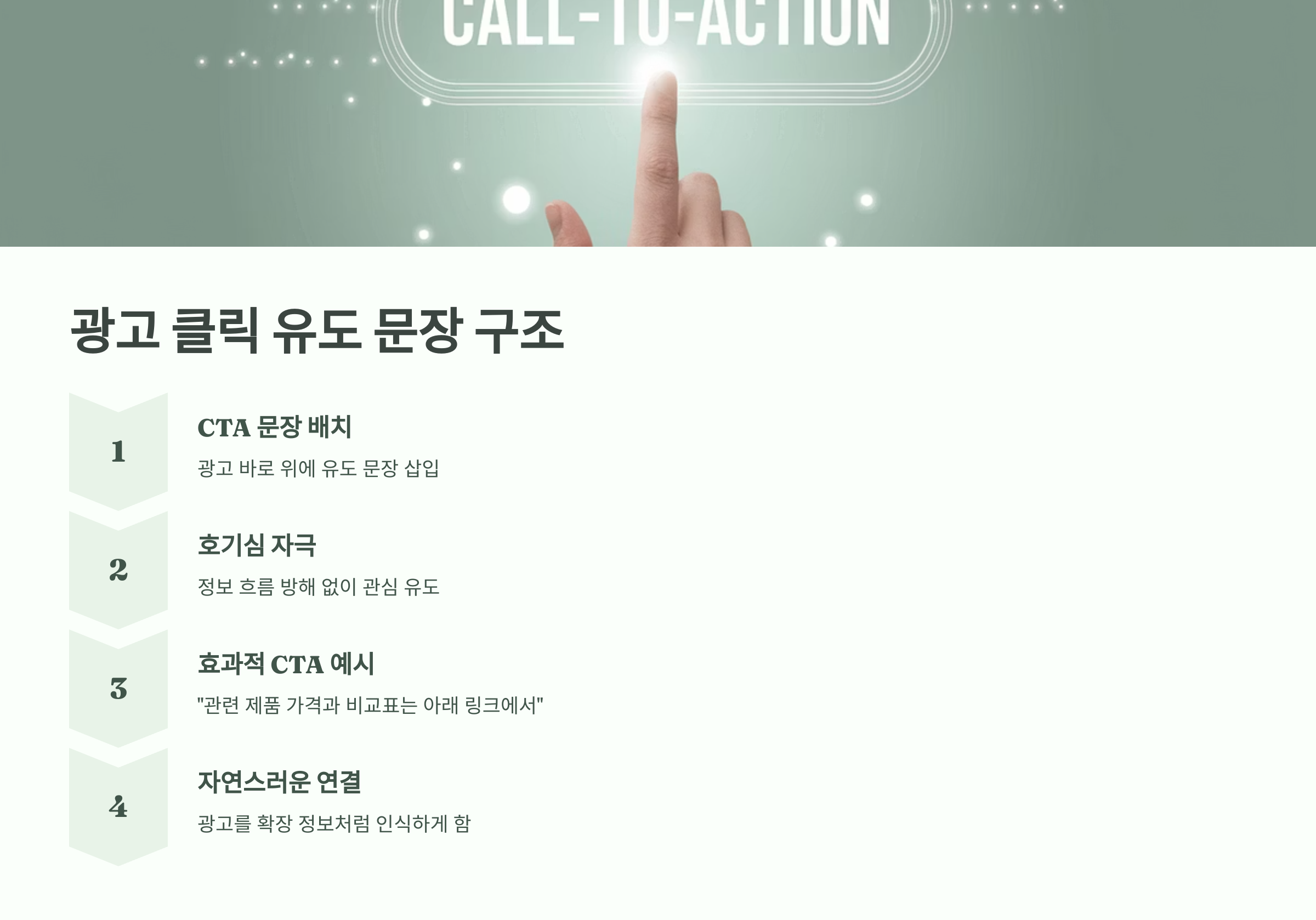 이 CTA 문장 바로 아래에 광고를 배치하면 클릭률이 급격히 상승합니다. 이 방식은 정보 흐름을 방해하지 않고, 오히려 사용자의 호기심을 부추깁니다.