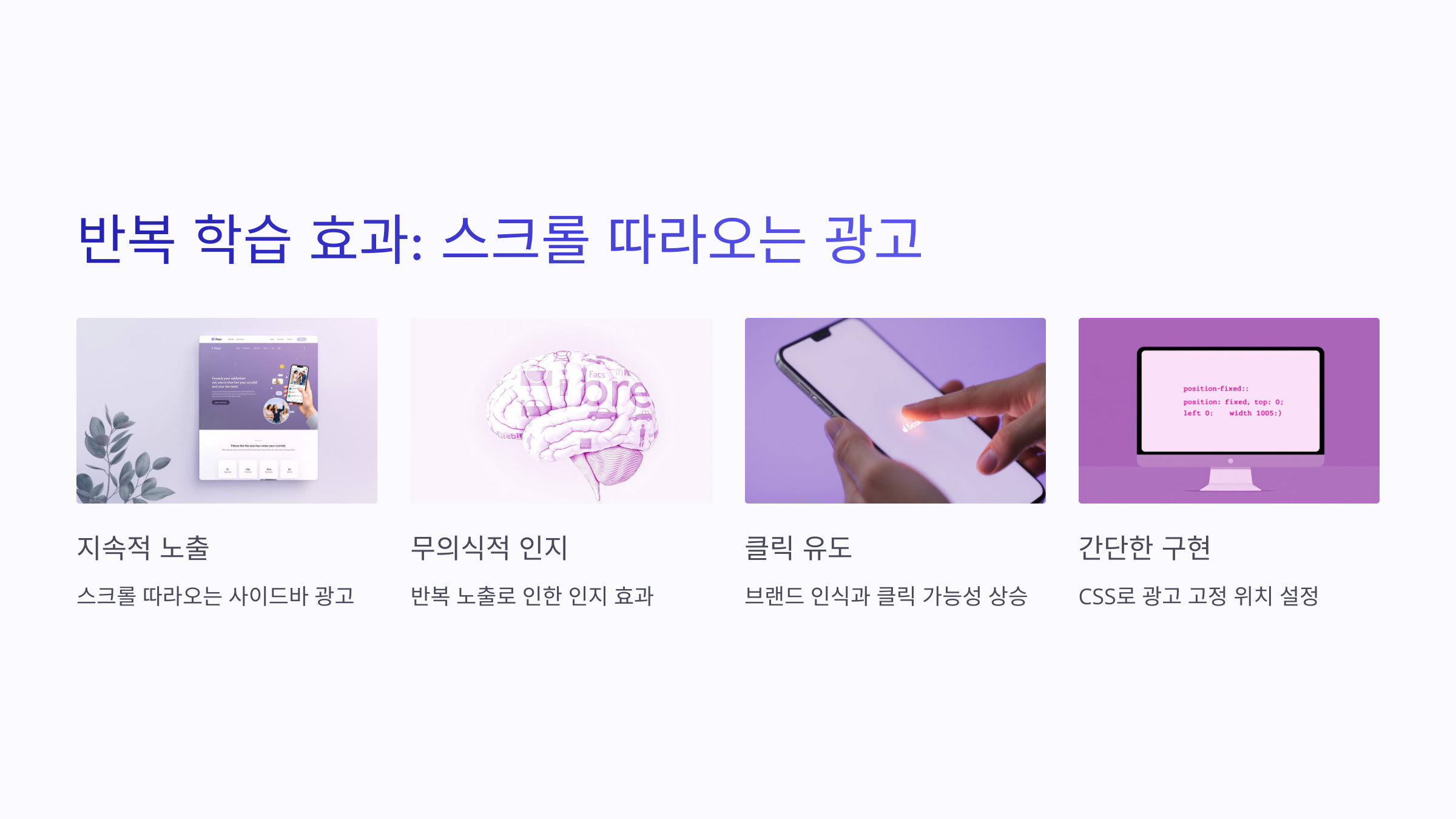 - 사이드바 상단: 고정형 광고로 사용자가 스크롤해도 계속 노출되며 반복 학습 효과를 줄 수 있습니다.