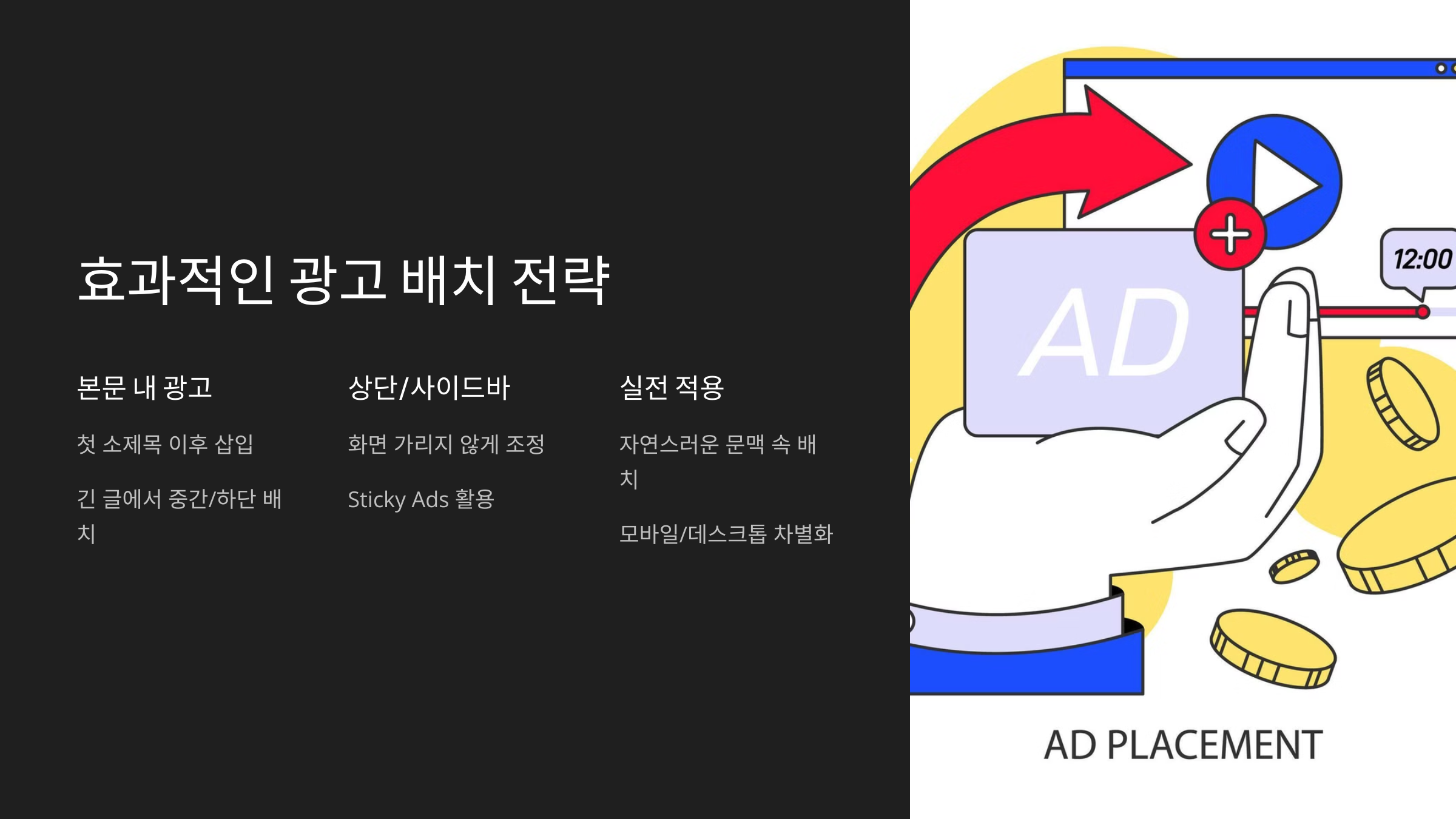 📌 실전 적용법: ✔ 광고를 너무 가까이 배치하지 않고, 자연스러운 문맥 속에서 배치