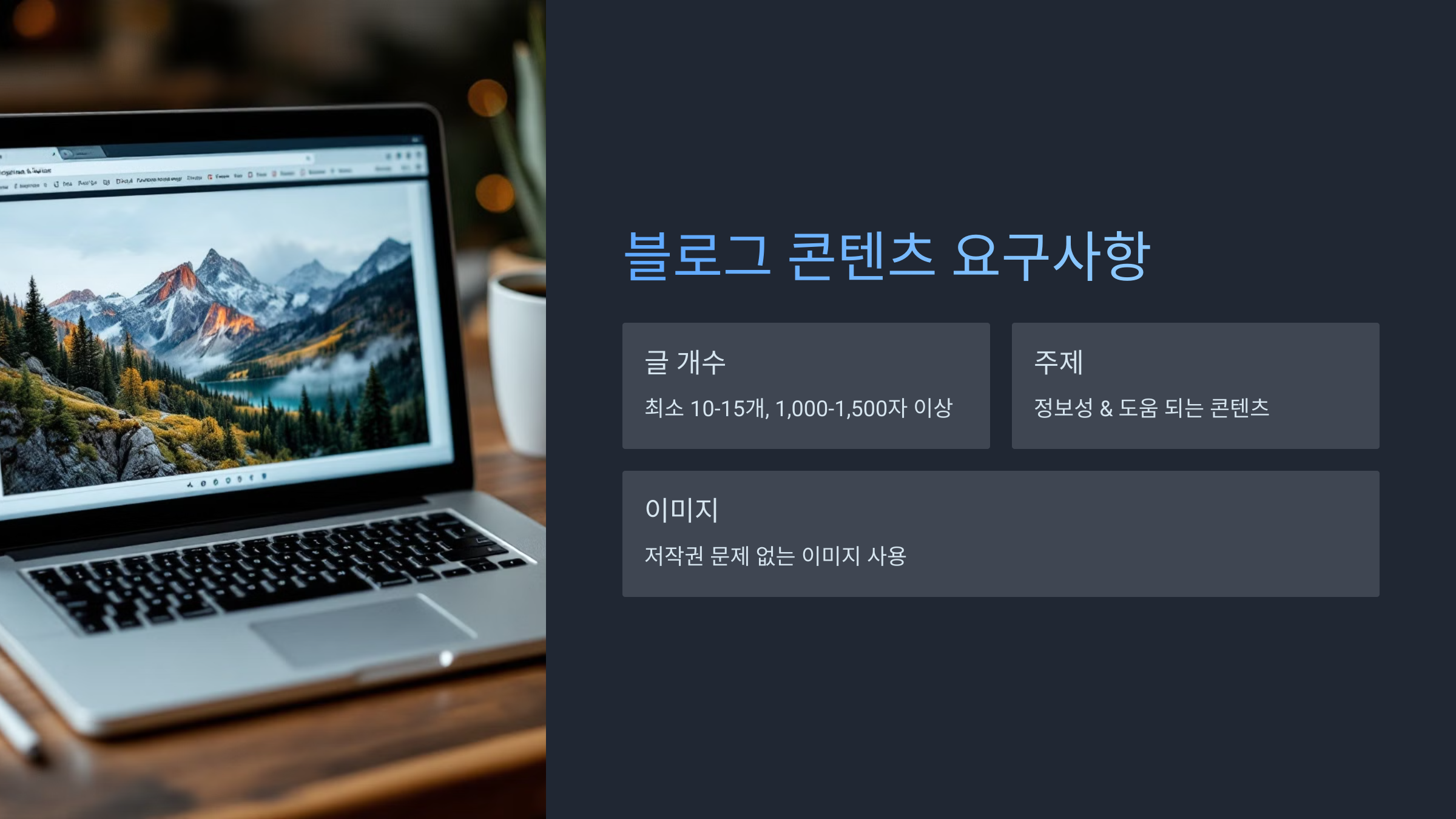 - 글 개수: 최소 10~15개 (1,000~1,500자 이상)