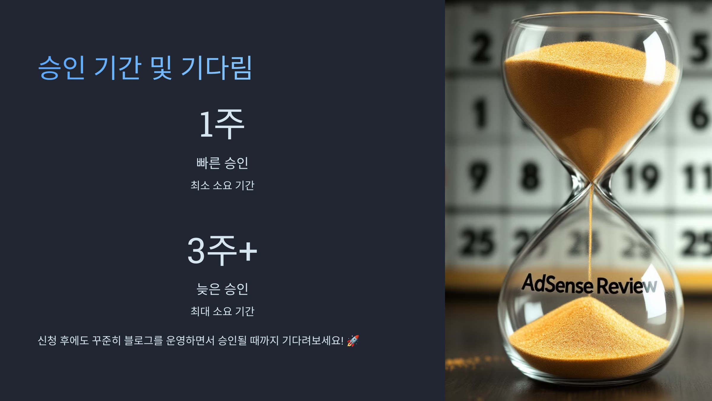 애드센스 승인은 빠르면 **1주**, 늦으면 **3주 이상** 걸릴 수 있습니다.