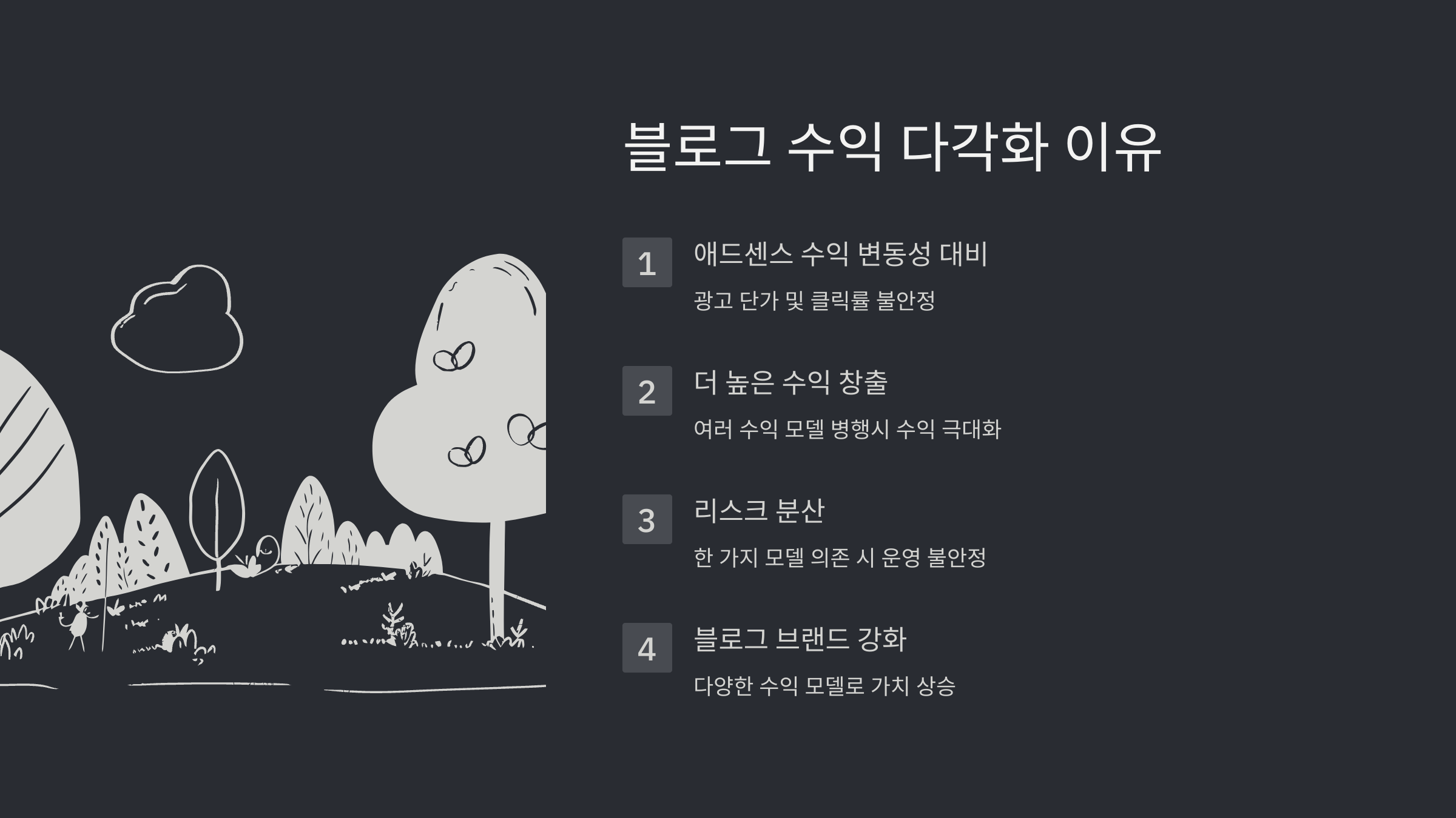 ✅ 리스크 분산 – 한 가지 수익 모델에 의존하면 블로그 운영이 불안정해질 수 있음