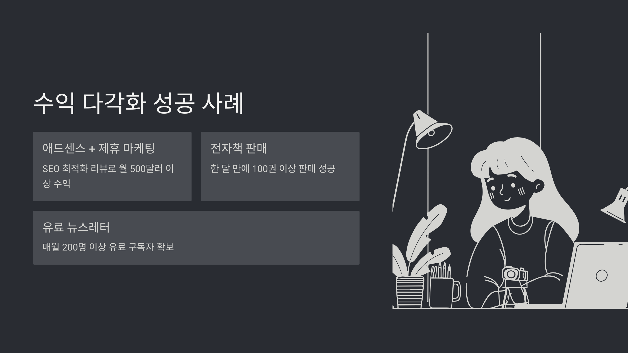 ✔ 애드센스 외에도 제휴 마케팅, 디지털 제품 판매, 유료 뉴스레터 등을 활용