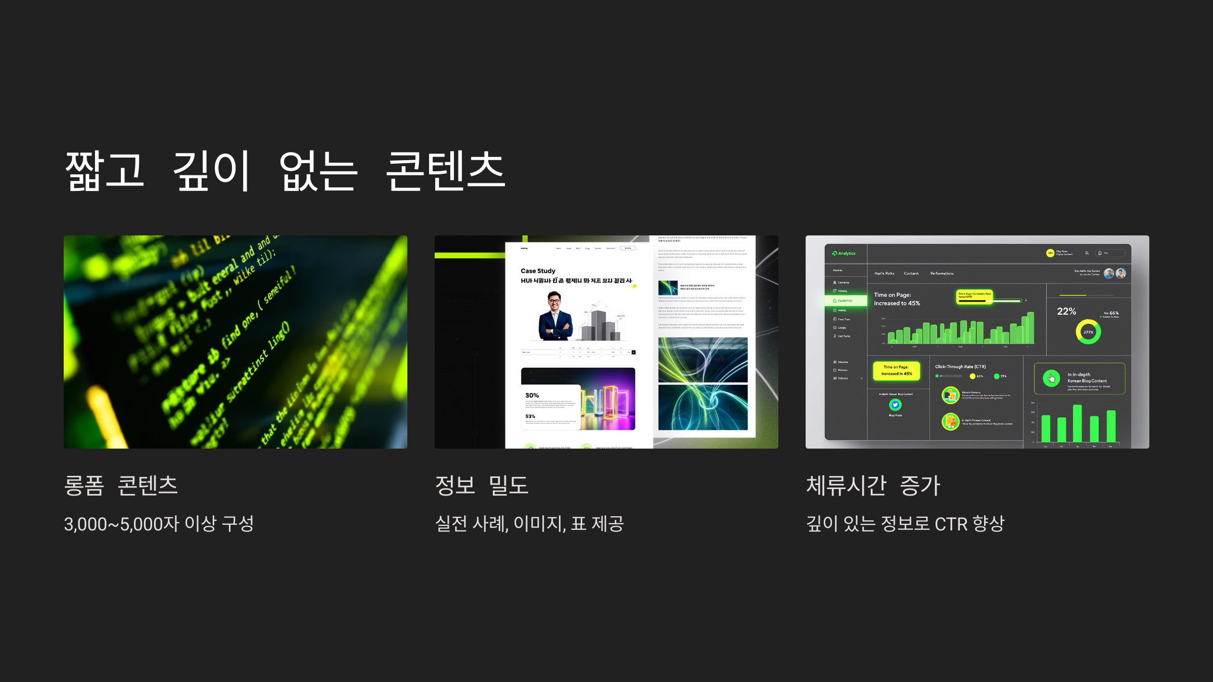 또, 내용이 얕고 반복적이면 방문자는 광고 클릭 전에 페이지를 벗어나게 됩니다. 결국 클릭률(CTR)과 체류시간 모두 낮아지게 됩니다.