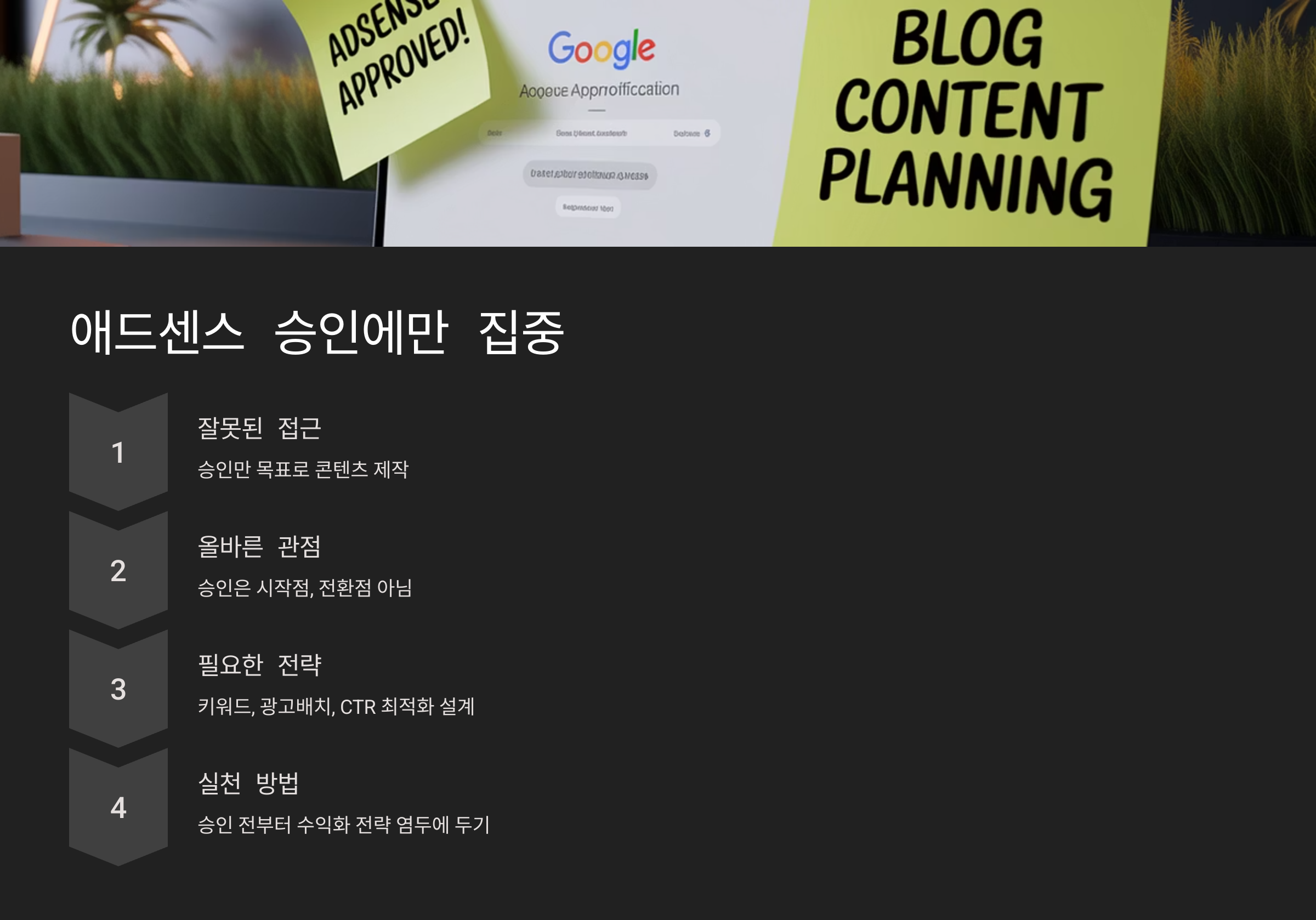▶ 추천 전략: 승인 이전에도 수익화 전략(광고 배치, 키워드 목적, 클릭 유도 문구 등)을 염두에 두고 글 구성 연습하기