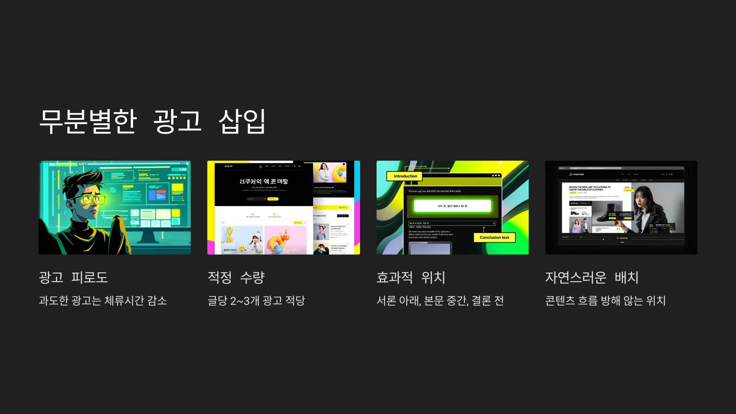 애드센스를 붙이자마자 모든 위치에 광고를 깔아버리는 실수도 매우 흔합니다. 방문자는 광고 피로도가 매우 높은 상태이며, 광고가 지나치게 많으면 오히려 블로그 체류시간과 클릭률이 떨어집니다.