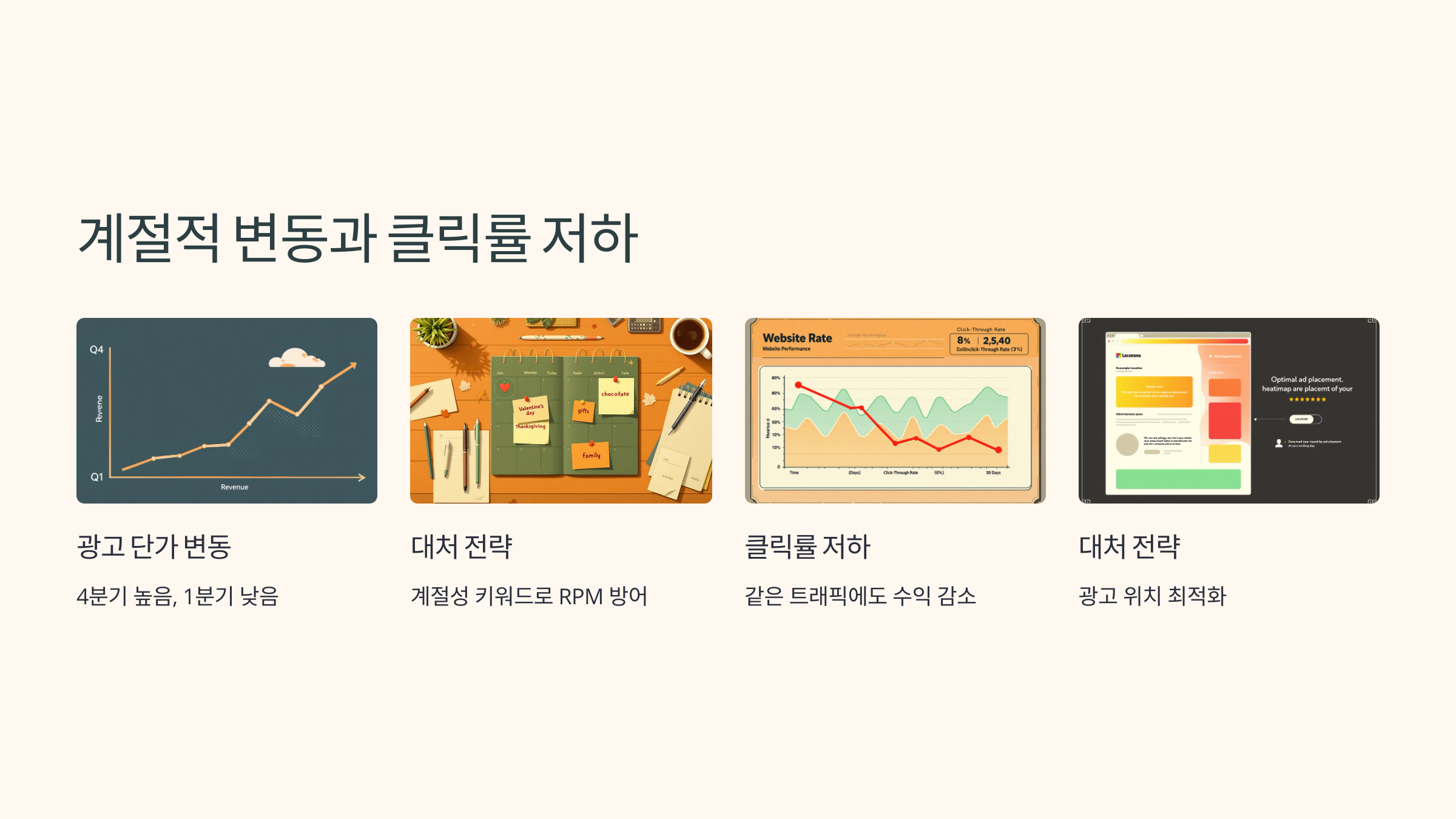 대처 전략: 고정 트래픽이 있는 글 외에 계절성 키워드(예: 연말 선물 추천, 설날 특가 등)를 보완 콘텐츠로 구성해 전체 RPM을 방어하는 전략이 효과적입니다.