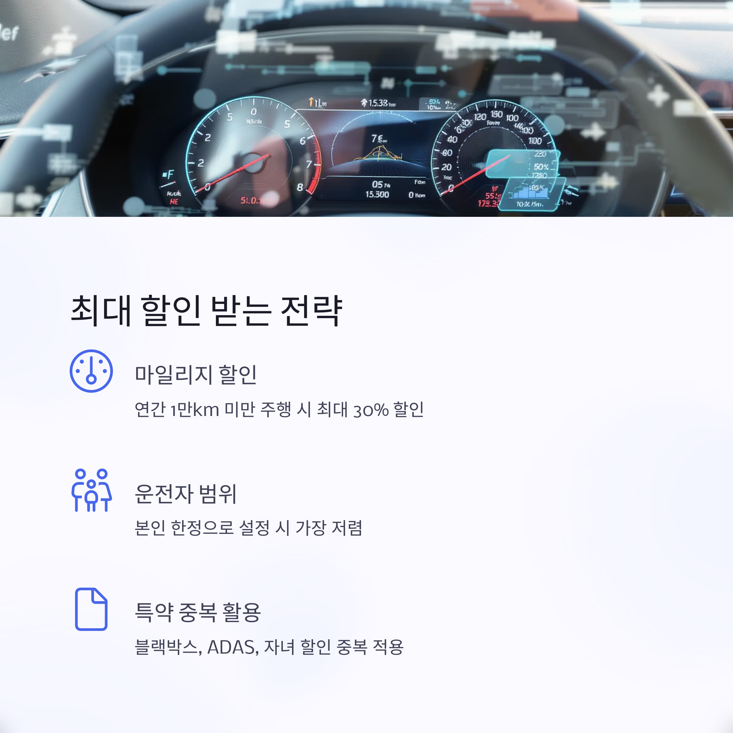 ‘마일리지 할인 특약’은 연간 주행거리가 1만 km 미만인 경우 최대 30%까지 할인됩니다. 직장인, 재택근무자, 도심 거주자에게 특히 유리하죠. - 5천 km 이하: 최대 할인 - 1만 km 이하: 평균 할인 - 계기판 사진 제출 필수 주행거리가 적은 분들은 이 특약을 반드시 챙기세요!