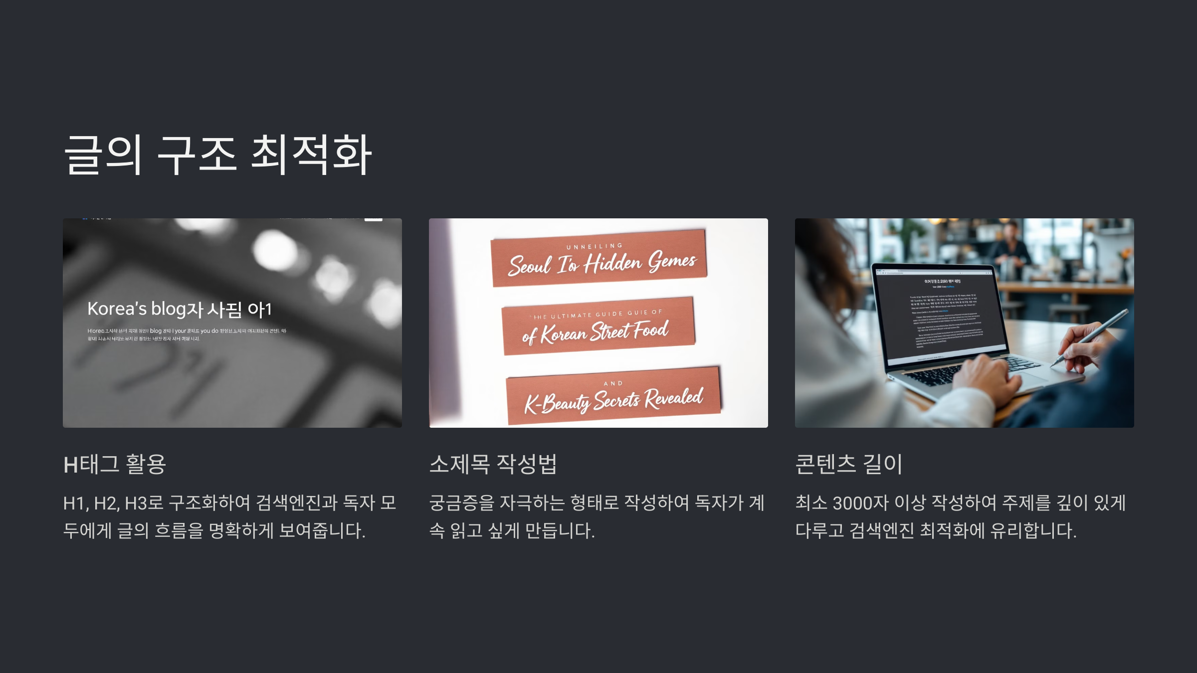 구글은 콘텐츠의 구조를 중요하게 평가합니다. H1은 제목, H2는 주요 섹션, H3는 하위 섹션으로 구분하여 작성하면 검색엔진이 글의 내용을 쉽게 파악할 수 있습니다. 이와 같은 구성은 사용자에게도 가독성을 높여주기 때문에 체류시간 증가에도 효과적입니다.